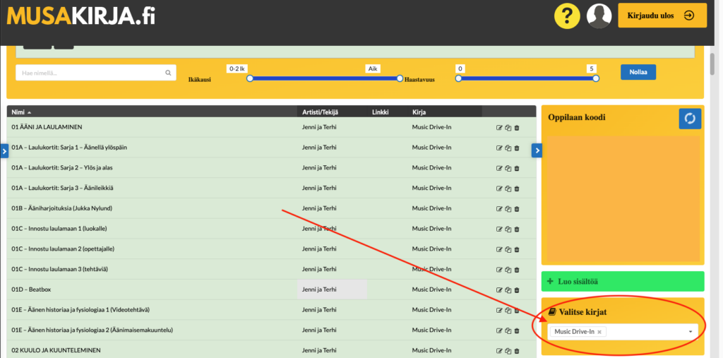 Materiaalit on ryhmitelty alkuperäiseen tapaan pääotsikoiden alle (esim. 01 ÄÄNI JA LAULAMINEN). Pääotsikko-sivuilta löytyy koonti kyseisen aihealueen materiaaleista, ja kullekin yksittäiselle materiaalille on määritetty siihen sopivia tageja helpottamaan halutun sisällön hakemista.