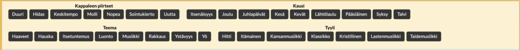 Tageja valitsemalla voit rajata näytettävien kappaleiden listaa. Kappalelistalla näytetään ainoastaan kappaleet jotka sisältävät valitsemasi tagit. Voit valita yhden tai useamman tagin. Esimerkiksi voit etsiä duurisävellajin joululauluja joissa on sointukierto valitsemalla tagit: ”Duuri”, ”Joulu” ja ”Sointukierto”. Voit palata kaiken sisällön listaan klikkaamalla ”Nollaa”-nappia.