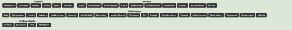 Tageja valitsemalla voit vastaavasti rajata myös näytettävän opetusmateriaalin listaa (myös Music Drive-In -sisällöt). Voit palata kaiken sisällön listaan klikkaamalla ”Nollaa”-nappia.