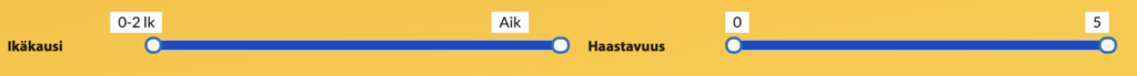 Suodattimilla voit rajata sisältölistaa ikäkausittain (0-2 lk, 3-5 lk, 6->lk, Aikuiset) sekä materiaalin haastavuuden mukaan (0 = helpoin, 5 = haastavin). Voit palata kaiken sisällön listaan klikkaamalla ”Nollaa”-nappia.