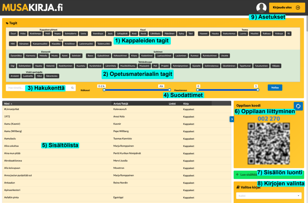 - Sisältölista: avatessasi pääsivun ensimmäistä kertaa, tällä listalla näkyy kaikki Musakirjan sisältösi. Sisältörivin nimeä klikkaamalla voit avata varsinaisen sisällön. Voit rajata Sisältölistaa tekemällä valintoja pääsivun osioissa: 1, 2, 3, 4 ja 8. Sisältölistalla kappaleet näkyvät oranssilla taustavärillä ja kaikki muut sisällöt vihreällä.